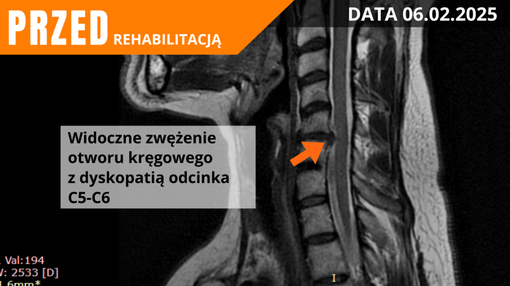 Pacjentka od kilku miesięcy zmagała się z narastającym bólem odcinka szyjnego, który promieniował do kończyny górnej i powodował drętwienie palców. Rezonans magnetyczny potwierdził dyskopatię C5/C6 z modelowaniem rdzenia i foraminostenoza po stronie lewej. W wywiadzie pacjentka podkreślała zmęczenie bólem oraz ograniczenia w codziennym funkcjonowaniu. Lekarz wskazał możliwość leczenia operacyjnego, ale równocześnie zalecił rozpoczęcie rehabilitacji i unikanie przeciążeń.