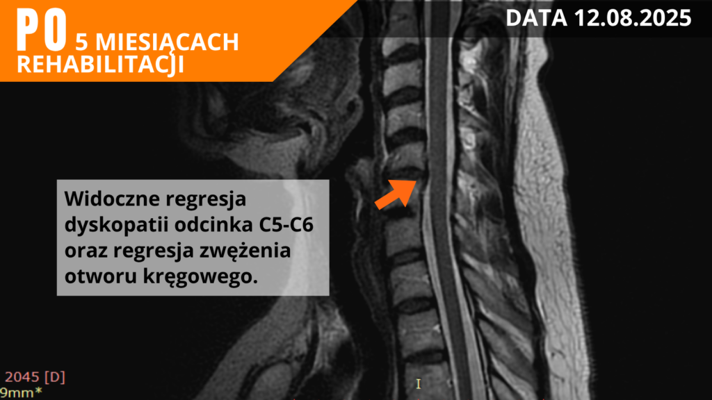 22.08.2025 – Ostatnia wizyta kontrolna u neurochirurga dr n. med. i n. o zdr. Tomasa Nytra Podczas ostatniej wizyty w sierpniu przeprowadzono kontrolny rezonans. Wynik badania okazał się wyjątkowo korzystny – stwierdzono regresję zmian, a pacjentka dzięki dobrej odpowiedzi organizmu na fizjoterapię po konsultacji z doktorem zdecydowała się zrezygnować z planowanego zabiegu operacyjnego. W codziennym życiu odczuwa już niewiele objawów bólowych, a ewentualne dolegliwości pojawiają się jedynie po dużym przeciążeniu fizycznym lub psychicznym.